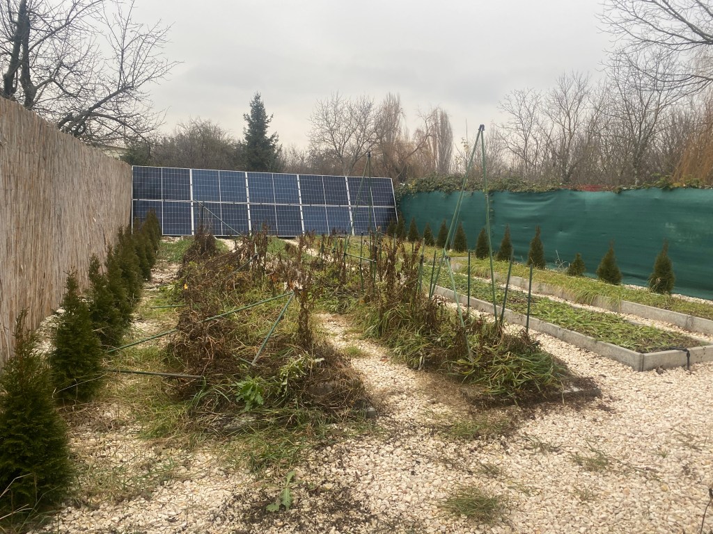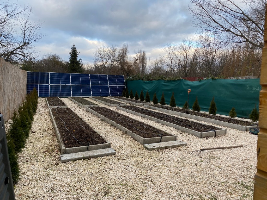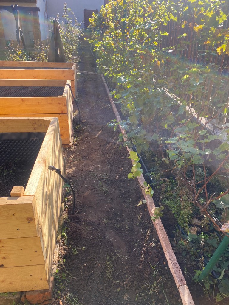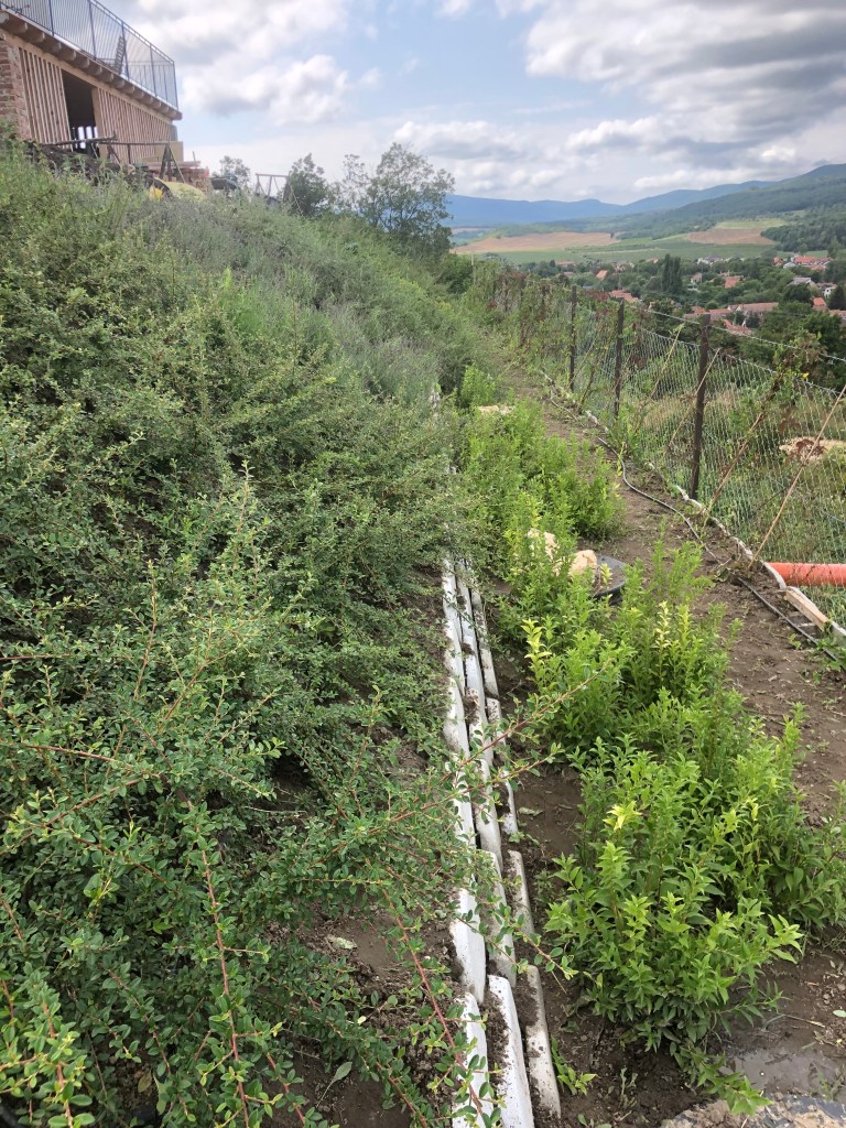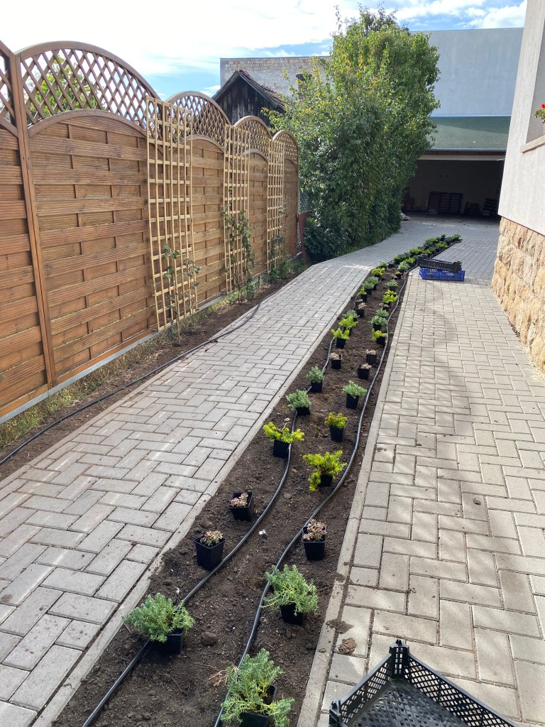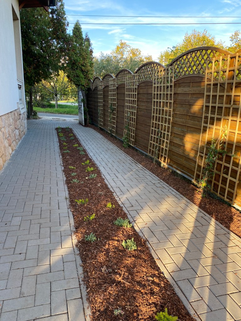 Az alábbi képeken összehasonlításban látható a tulajdonos kérése, mely az volt, hogy a kocsibeálló közötti sávrész növényekkel borított legyen. Így talajtakaró varjúhájakat ültettünk be, melyek csepegtető csővel vannak ellátva és a fakéreg takarja őket. Ezek a növények teljes fedettséget fognak adni a lemulcsozott területnek. Az apácarácshoz pedig futónövényeket ültettünk. (Clematis montana, Lonicera japonica)